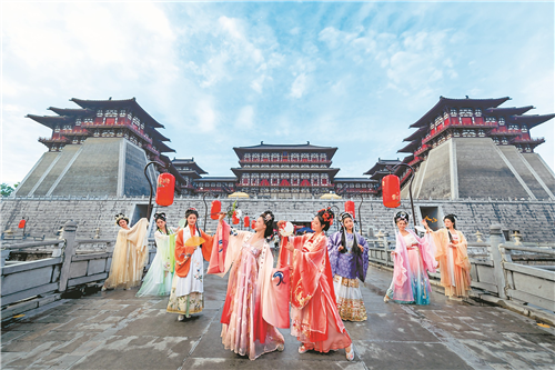 在隋唐洛阳城国家遗址公园,一群身着汉服的年轻游客流连穿梭,明堂、天堂、九洲池……衣袂飘飘间,千年汉服“穿”越时光,与璀璨灯火交相辉映。